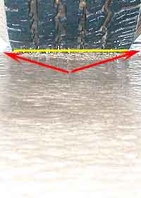 out the sides (red arrows) and backwards within the tire treads.